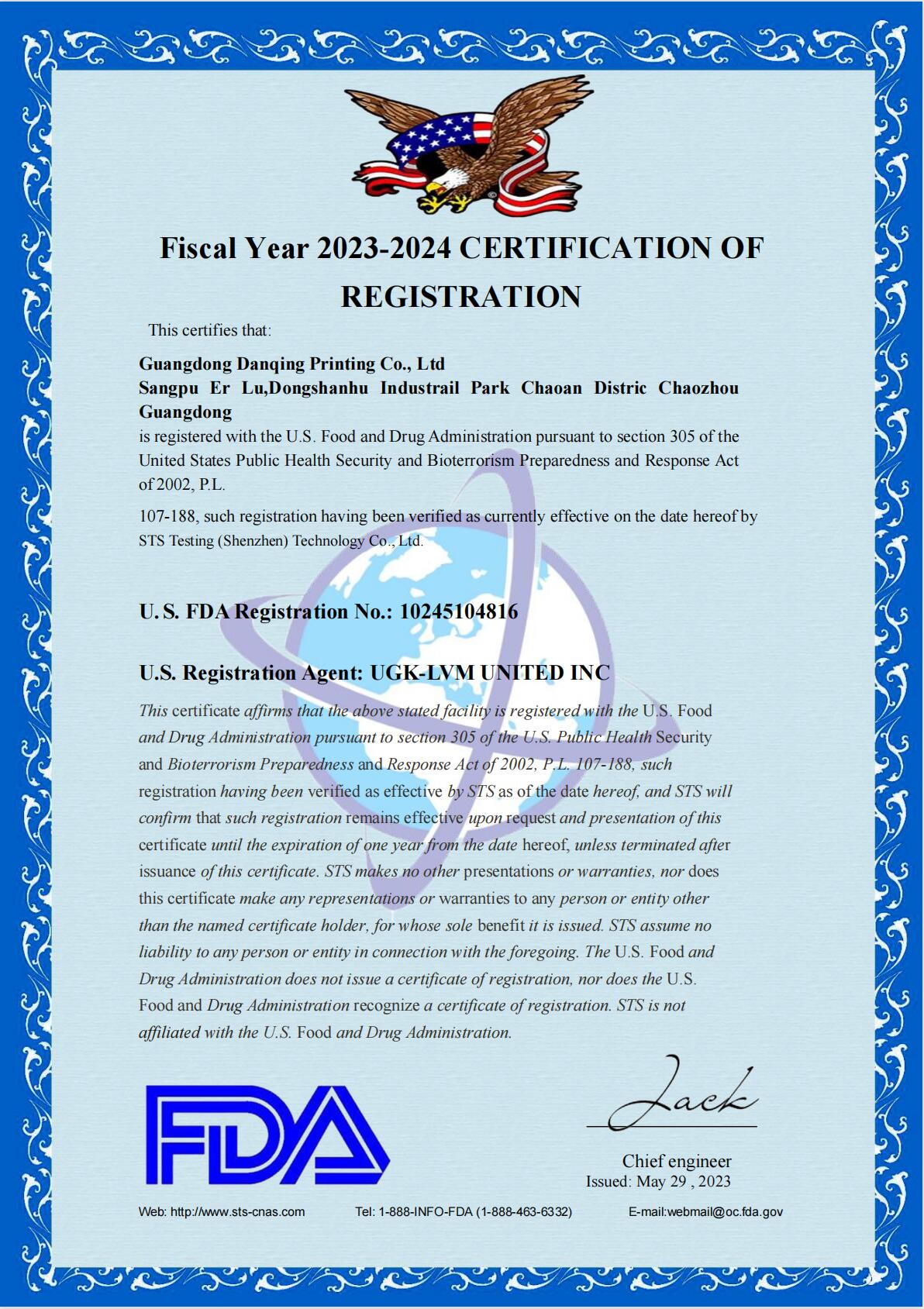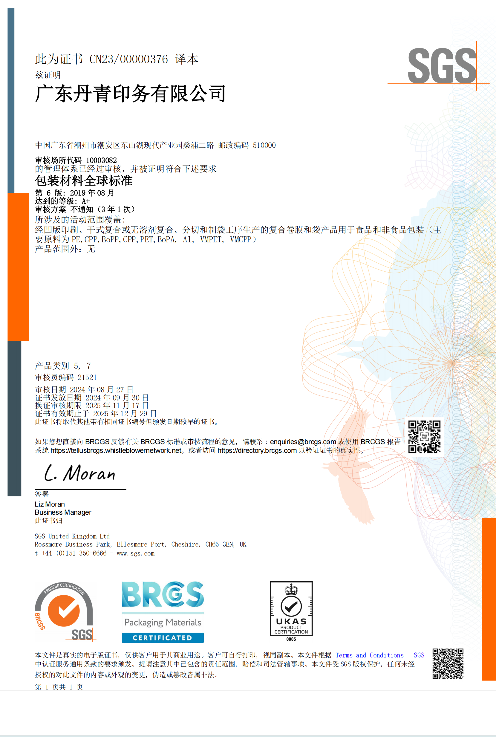 公司通過包裝材料全球標(biāo)準(zhǔn)(BRCGS)認(rèn)證,